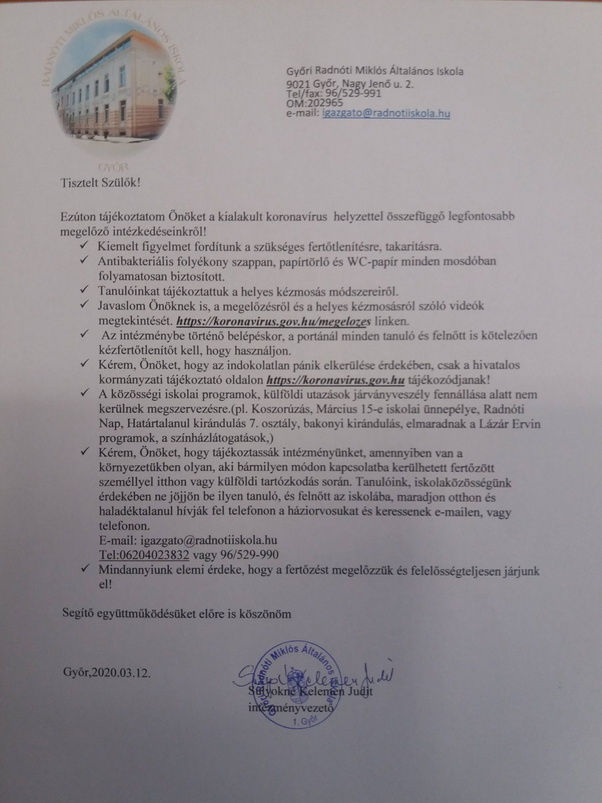 Tájékoztatás a koronavírussal kapcsolatban kialakult helyzetről