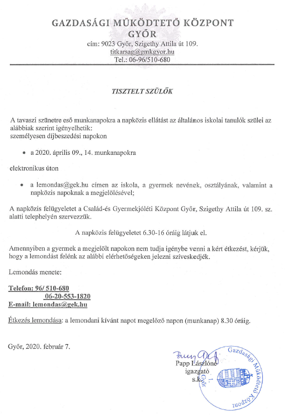 Intézményünkben az egyházak képviselői 2020. március 9-én, hétfőn 15.30 órakor a jövő évi hit- és erkölcstan oktatás megszervezéséről tartanak tájékoztatót, melyre tisztelettel meghívom.