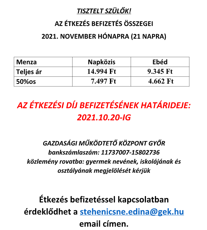 Az étkezési díj befizetésének összegei 2021. december hónapra: Bővebben